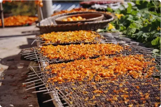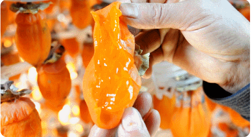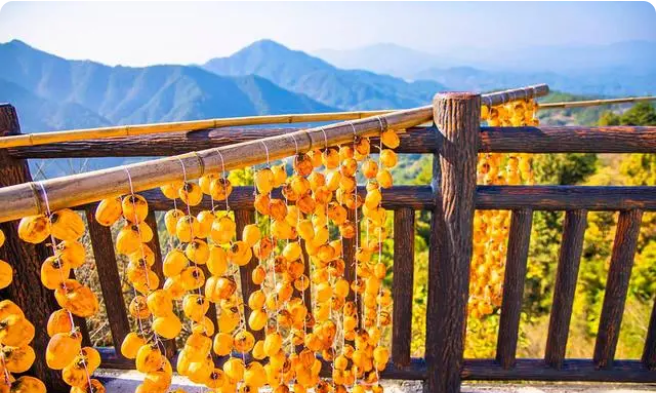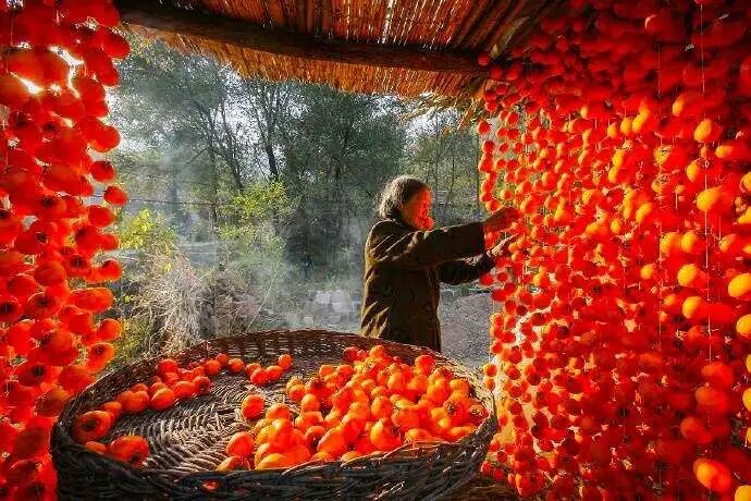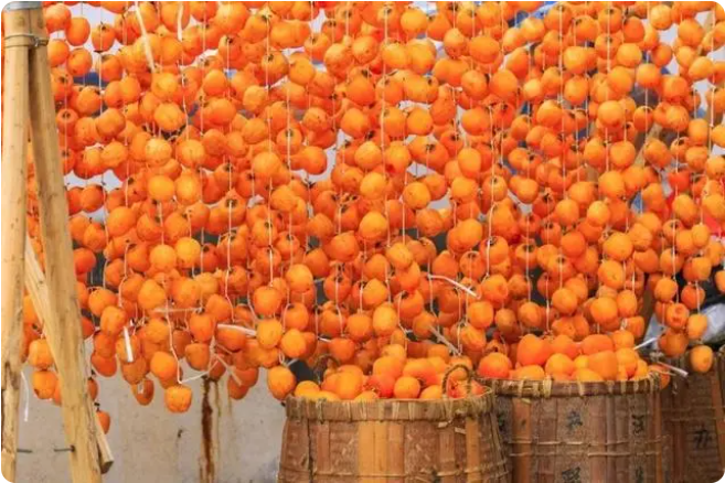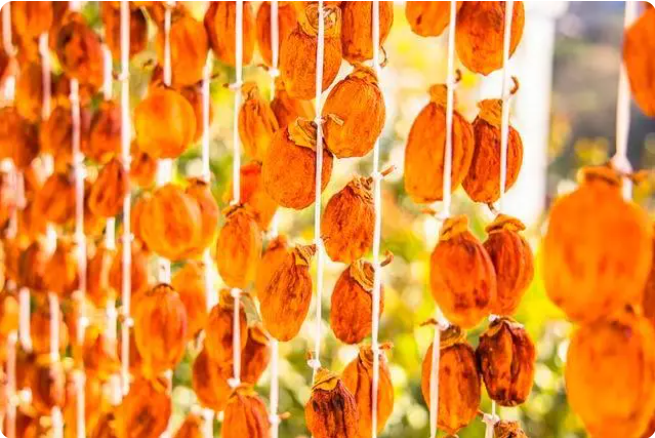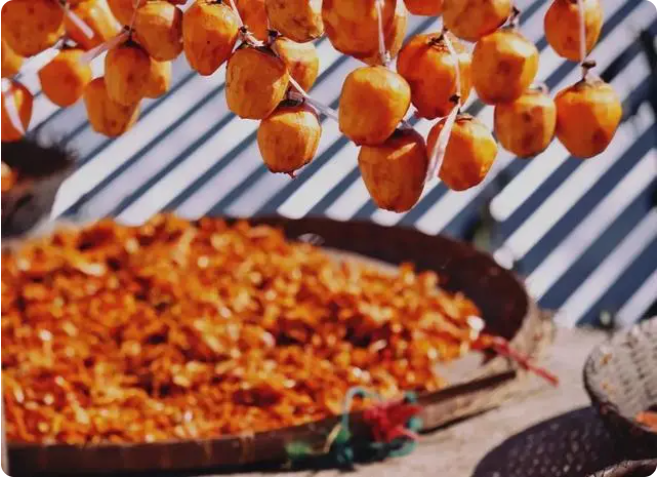 姬公山柿饼就是这样挂在户外,反复晒,尽情吸收阳光的紫外线,差不多需要一个多月的时间,从水灵灵晒到一团浓缩的坨坨,全身披上一层厚厚的柿霜才算修成正果。晒柿饼过程,就如见证一个水灵灵的姑娘慢慢变老的生命历程。