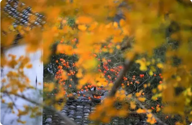 秋日,姬公尖的灯笼柿成熟正盛。黄澄澄,红彤彤,结在树头,挂在墙边。抬头看,红灯笼般的柿子一颗一颗,围绕在前后左右,四周院落一片斑斓。