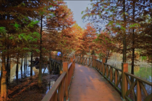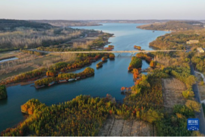 天泉湖湖面状如皇冠,呈五指摊开,一年四季的景色各异,朝朝暮暮更是气象万千。天泉湖独特的景观——“水上森林”,缘起于20世纪90年代,当地在天泉湖生态建设时推广种植红杉。晚秋,众多色彩鲜艳的红杉挺拔于天泉湖中,形成了独特的风景画卷。