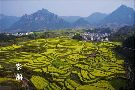 家朋乡的油菜花属于梯田油菜花,最大的梯田位于梅干岭,层层叠叠的梯田缓缓向四周蔓延,高低错落有致,流畅的线条,饱满的层次,丰富的色彩,给人一种极大的震撼。