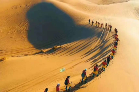 7:00起床,早餐后收拾完营地,翻越大沙山,今日领队选择合适的滑沙地点进行滑沙;今日沿途可俯瞰月亮湖(不进入湖内),碧绿湖水、漫漫黄沙、蔚蓝天空在这里交织成一个美妙的画卷,继续行走10公里到达终点!