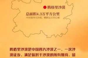 大漠风光:腾格里沙漠为中国四大沙漠之一,徒步过程中可见一望无边的大漠风光,沙漠湖泊或如中国地图,或如月牙一般,甚是神奇。