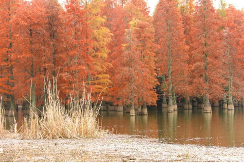 水杉适应性强,喜湿润且生长快,被大量投放到这里,再后来此处也修建了水库。人工种植加上大自然的馈赠,秋天的时候,这里展现了落羽杉独特的魅力,宛如仙境。