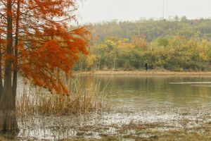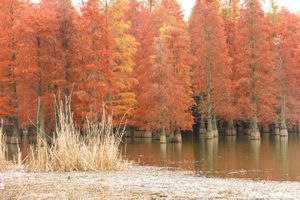 蓝天白云下,绯红的落羽杉如同倒置的红酒杯,矗立在如镜面一般的湖水上,偶尔飞过三两只水鸟,静谧但也“悠扬”。