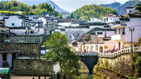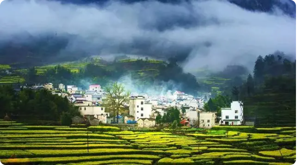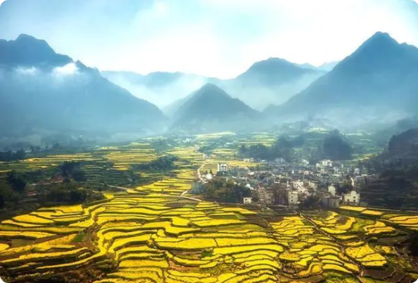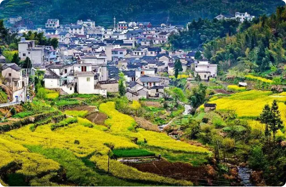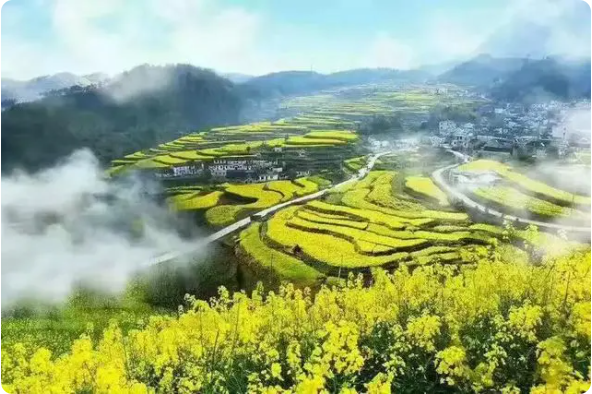在漫山遍野的金黄色中,掩映着的是白墙灰瓦的徽派建筑,簇拥在一块儿的村落、翘翘的马头墙、升起的袅袅炊烟,这一幅幅美丽的春日画卷宛如浓墨重彩的水墨山水画。