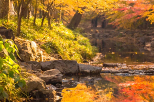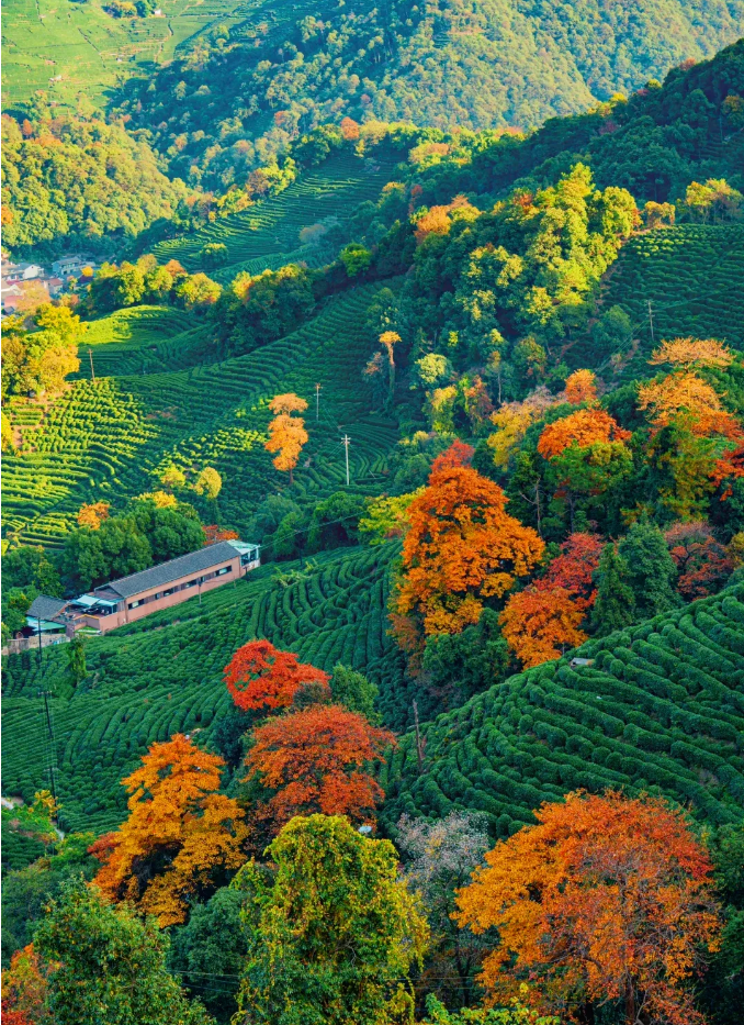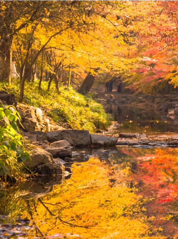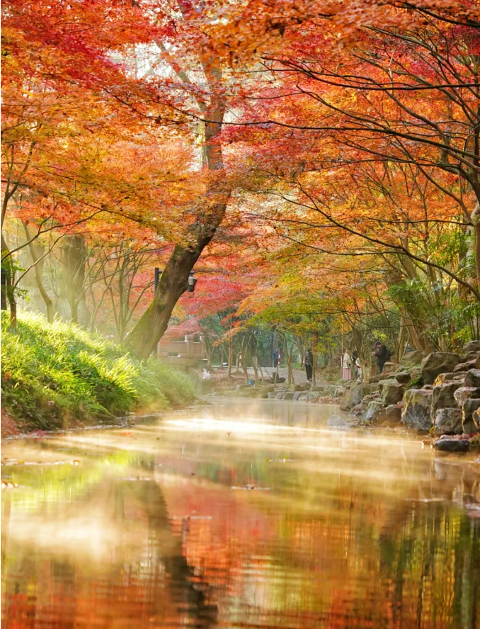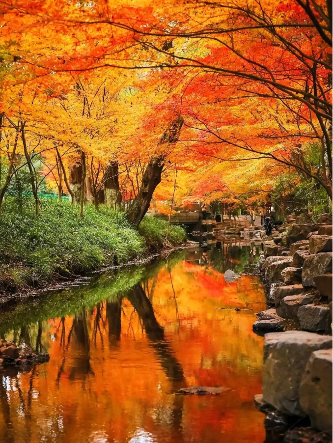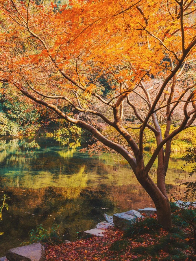 枫叶红到最浓烈时,眼睛根本无处安放,目光所及之处皆是层层叠叠。惊心动魄的红与黄,像上帝打翻的调色盘,还是精心搭配了色彩的那种。