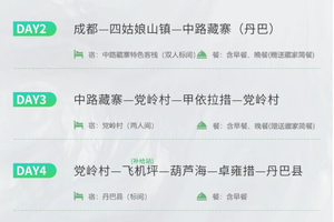【费用包含】1、交通:当地全程交通费用,根据人数选择合适车型;2、住宿:按照行程所列标准入住(1晚酒店+1晚客栈+2晚多人间);3、餐饮:全程包含4早2正、藏家简餐;4、门票:党岭卫生费、甲依拉措门票;5、向导:专业户外向导全程服务(4人以下司机兼向导);6、装备:活动所需要的公用装备;7、保险:活动期间户外高原组合意外保险80万。