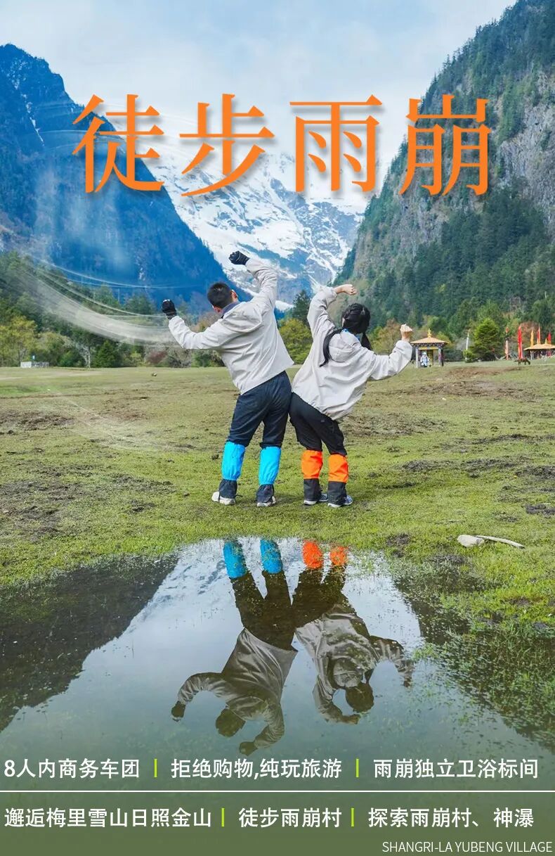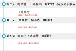 早上 7:30左右起床早餐后与雪山留影之后我们徒步尼龙峡谷走出雨崩村,徒步大概5小时左右→乘车前往经香格里拉(大概 18 点左右)→香格里拉高速路回到丽江解散大概 20:30点左右结束愉快徒步雨崩之旅。