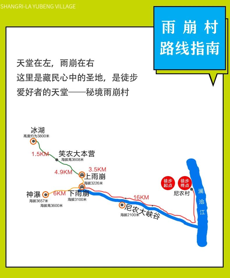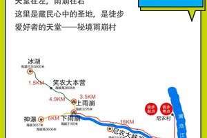 飞来寺(根据天气看梅里雪山,日照金山)→尼农村(徒步5小时,12.5公里左右)→雨崩村