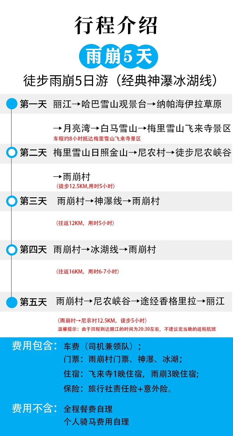 6、景区内交通:尼农(达吉农小卖部)-雨崩往返当地皮卡车;下雨崩-上雨崩往返当地皮卡车;雨崩-神瀑骑马费用;雨崩-冰湖骑马费用。