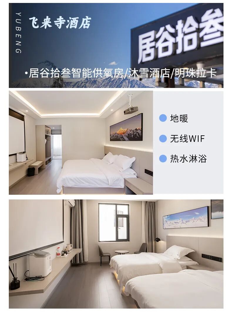 ▷住宿:飞来寺景区酒店(居谷拾叁酒店或者明珠拉卡2号楼或者沐雪供氧酒店/竹外云酒店/天景云野);