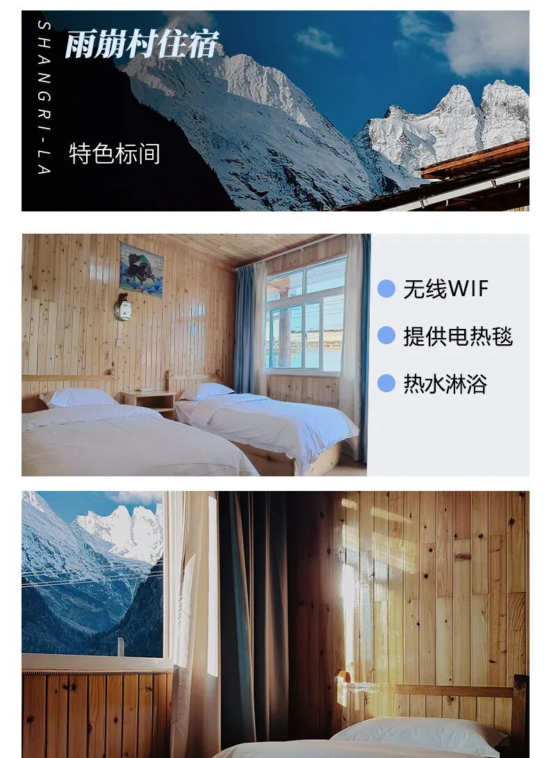 ▷住宿:雪域吉祥客栈/秘境客栈/假日酒店/雨崩山居客栈/日月星客栈/月半湾客栈/神瀑客栈/雪龙客栈/慕雪客栈/雨崩印象客栈;可加钱升级雨崩如果客栈/慕辰山舍客栈。