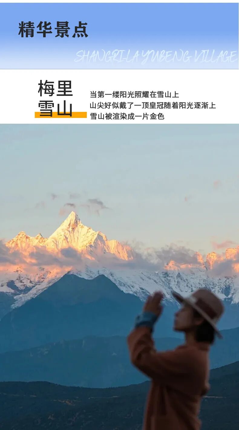 "早晨6:00分起来,拍摄难得一见的日照金山奇观,飞来寺观景酒店是拍摄梅里雪山最佳的位置,从这里你将领略藏区八大神山之首,世界最美的雪山之一,神圣的梅里十三峰。20分钟里金光映照的梅里雪山光芒万丈美不胜收(据藏民所说,日照金山是有缘人方可看到,看到后会幸运一整年)。