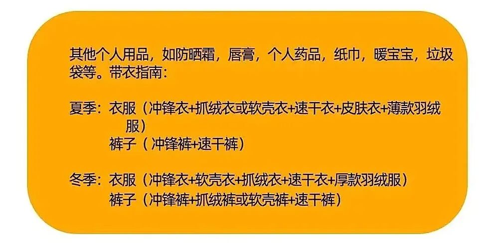 服装:白天速干衣+软壳/硬壳冲锋衣,早晚温差大需添加羽绒服/厚抓绒。