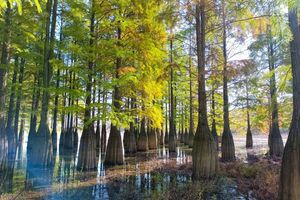 蓝天白云下,绯红的落羽杉如同倒置的红酒杯,矗立在如镜面一般的湖水上,偶尔飞过三两只水鸟,静谧但也“悠扬”。