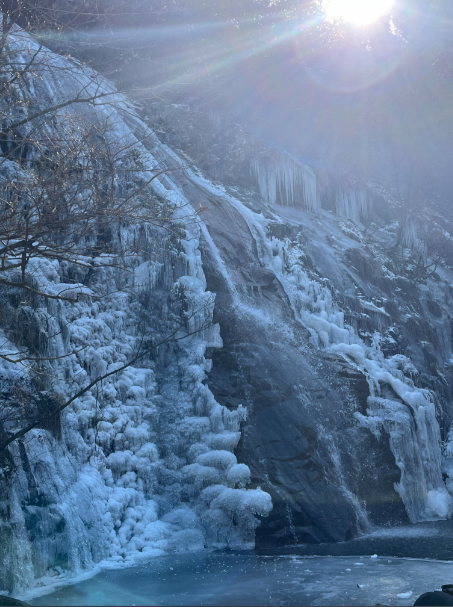 百丈冲瀑布在低温环境下,水流可能逐渐冻结,形成冰瀑或冰柱,呈现“飞流凝冰”的独特景观。