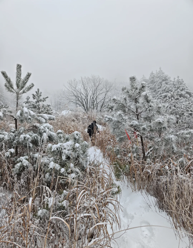 白马尖位于大别山腹地,主峰海拔超过1700米,是安徽境内最高的山峰之一。冬季来临,气温骤降,山间云雾缭绕,雪花悄然落下,将整座山脉染成一片素白。