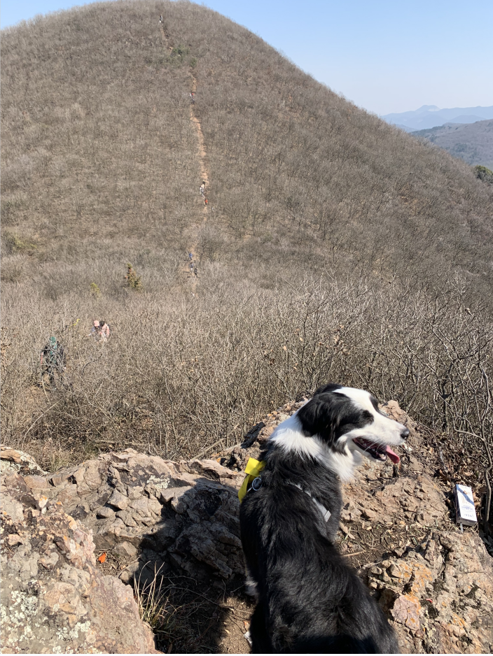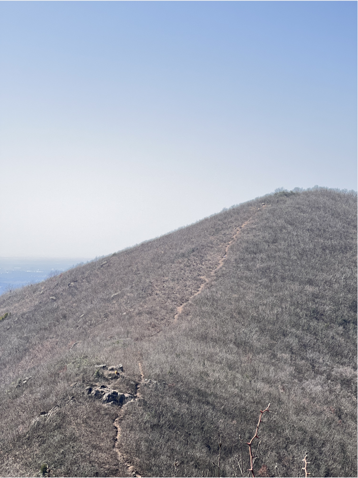 沿着山脊线继续前行,没有密林,只有低矮的草丛,草甸之上,隐约可见曲折的羊肠小道。山周边视野开阔,站在山顶,犹如融化在群山之中。