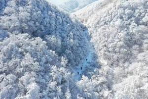 在许村镇箬岭古道,雾凇将山野重新装扮。漫步在蜿蜒而上的古道上,从古树苍松到灌木杂草,枝头上缀满了晶莹剔透的雾凇。白雾琼枝,千姿百态,美景如诗如画。