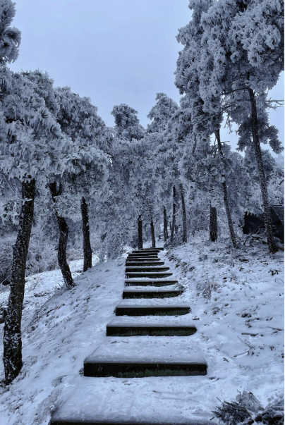 箬岭古道由于海拔较高,高山独特的冰雪雾凇美景变成了一个银白色的世界,真让人惊艳。那种场景,简直像是从画里走出来的一样,仿佛进入了童话般的梦境。漫山的树木披上了白色的霓裳,给人一种苍茫大地的感受。