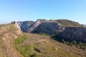 沿着山山凹山脊线行走,断壁残垣,生机和沧桑共存一览众山小,很是壮阔。一侧生机盎然。另一侧断壁残垣,寸草难生,又有一种沧桑感。”