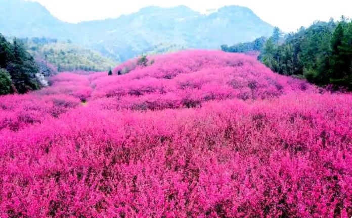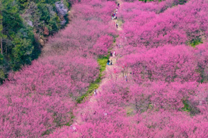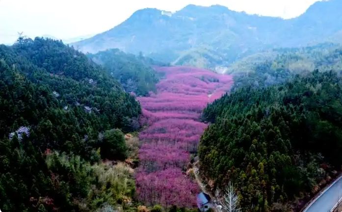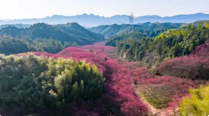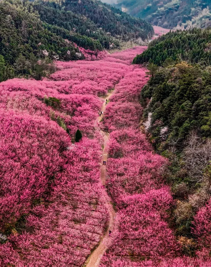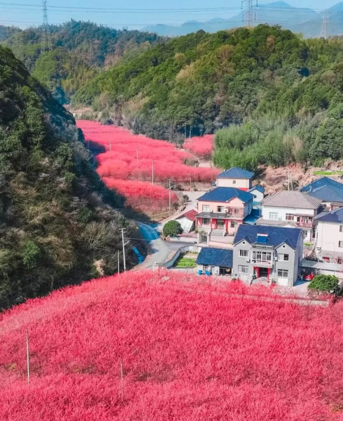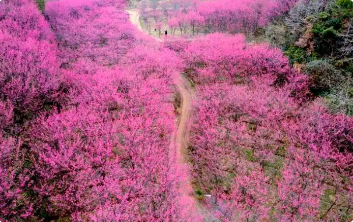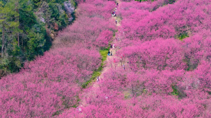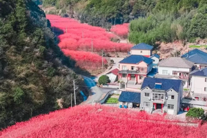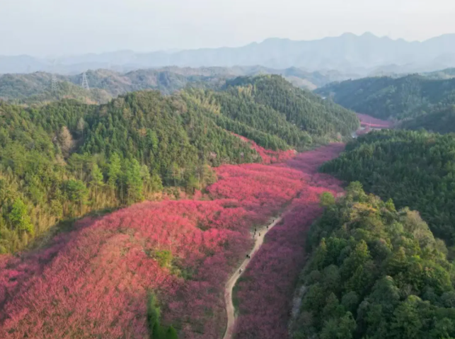 春风掠过临安,最先被点染的总是玲珑街道米积村。近千亩花田里,十万株“中国红”樱花同时绽放,像谁打翻了霞光,又似雪片集体坠落。垂枝低拂,风一过,花瓣旋转成一场无声的春雪,铺满山谷、游步道与游客的发梢。
