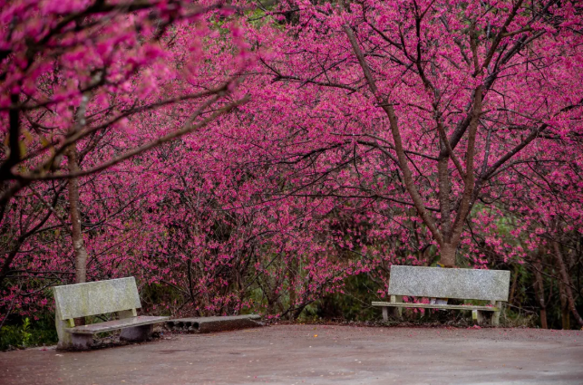 抵达山顶后,一座历史悠久的古寺——天龙禅寺,便展现在眼前。在红樱的映衬下,这座古寺更显得庄严肃穆且浪漫非凡,山顶的寺庙可以远眺花海。