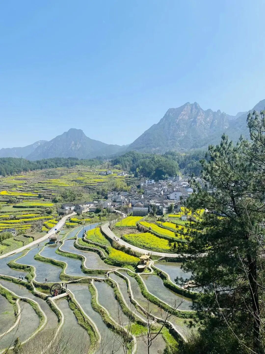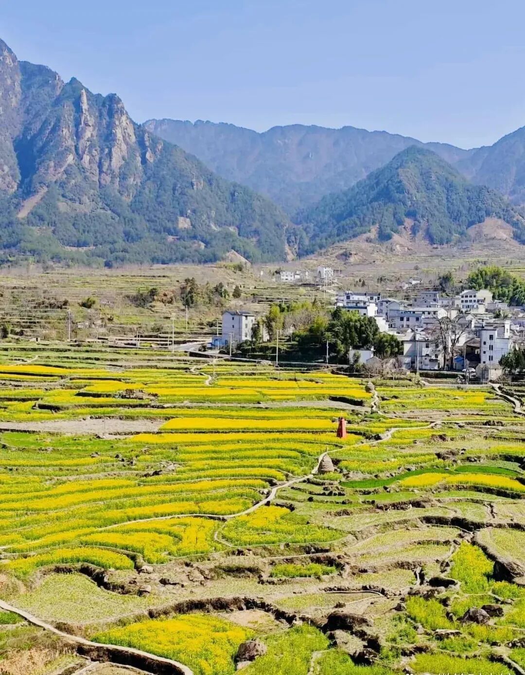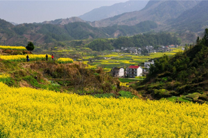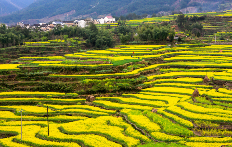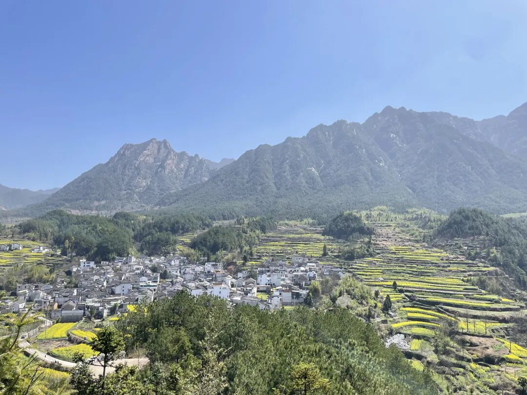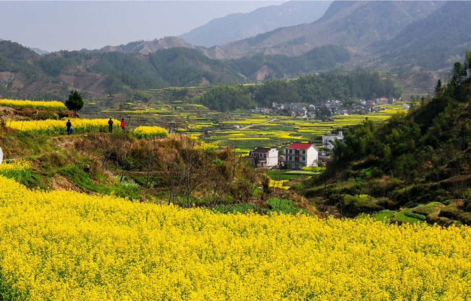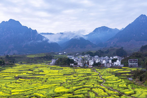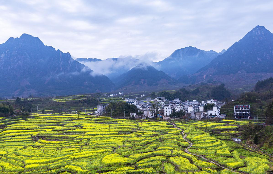 不远处一座座徽派民居散落于花海与云雾、青山之间素雅的白墙黛瓦与明艳的金黄花海相映成趣,水墨氛围感十足处处都是天然取景框尽显徽州乡村的独特韵味。
